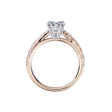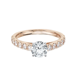 18k rose gold Pavé diamond engagement ring featured with raised cathedral shoulders and a pave-set diamonds. Handmade and set to your choice, four slim white gold prongs support the center stone.